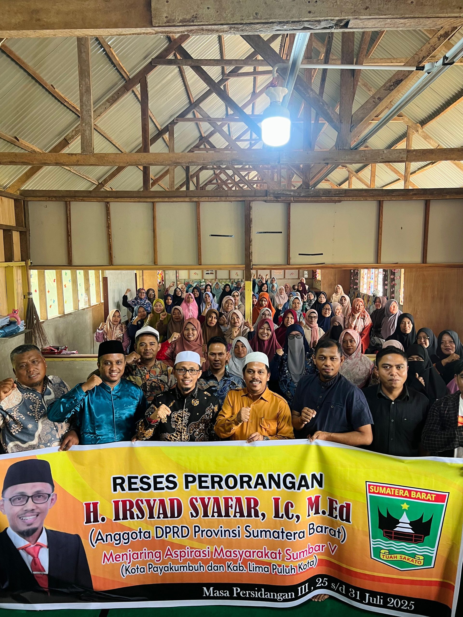 LIMAPULUH KOTA (26/07/2025) –Anggota DPRD Provinsi Sumatera Barat, Irsyad Syafar, menyerap beragam aspirasi masyarakat saat menggelar kegiatan reses perseorangan masa sidang ketiga Tahun 2025-2026, Sabtu (26/7), di SD IT AR Risalah, Nagari Simalanggang, Kabupaten Lima Puluh Kota.