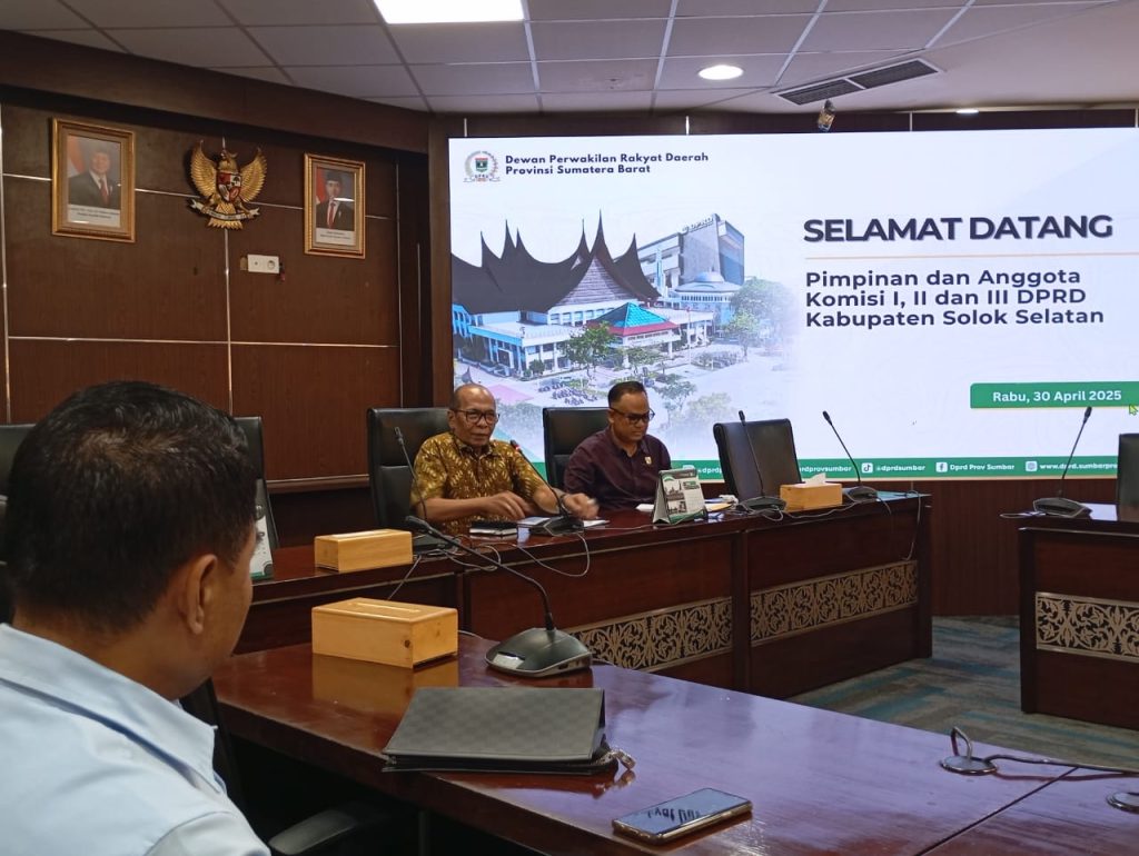 PADANG (30/04/2025) –DPRD Provinsi Sumatera Barat menerima kunjungan pimpinan dan anggota Komisi I, II dan III DPRD Kabupaten Solok Selatan, Rabu (30/4/2025) di ruang rapat Banggar kantor DPRD Sumbar.